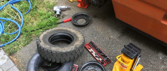 フォークリフトの現場パンク修理はスピードが命ですが、それ以上に「作業者の安全」が最優先です。