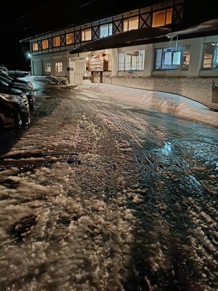 ただ、スキー場が見える温泉街あたりでは脇道というかメインの道路からちょっと離れた宿泊施設で駐車場近辺が雪で路面が見えなくなっていました。